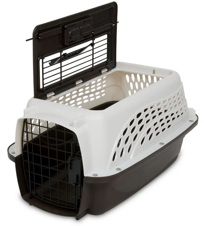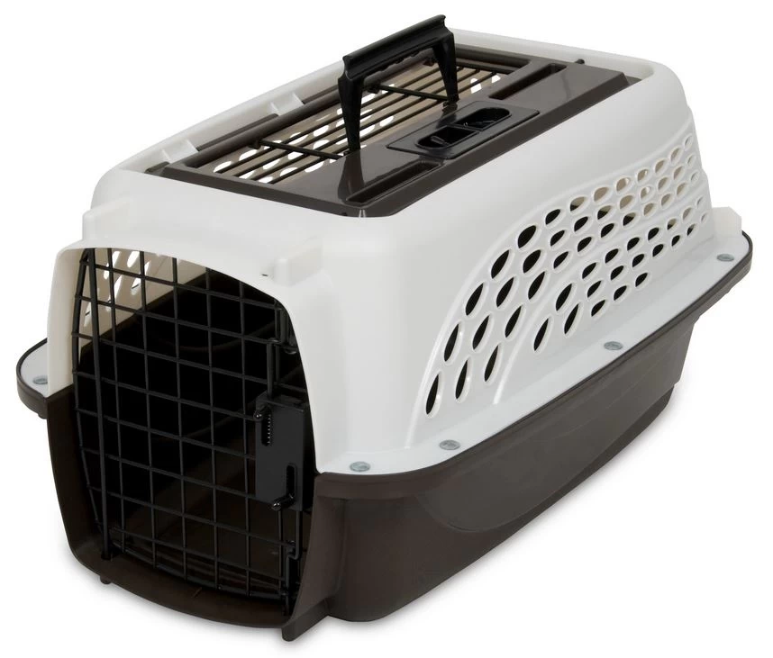 This carrier is rigid and with the help of the 2 doors, it is easier to enter your dog or your cat. It has a handle for travel. It is made of durable plastic. Openings allow air to circulate and your pet can see out. This carrier can support an animal up to 10 lbs (4.5 kg).