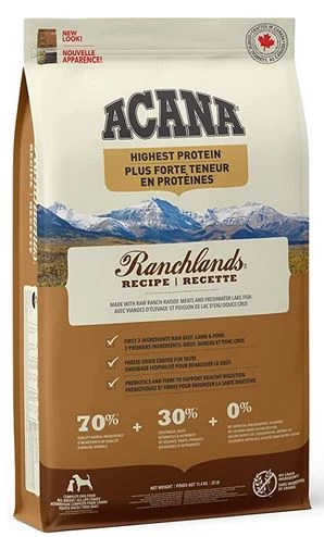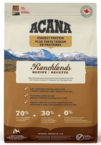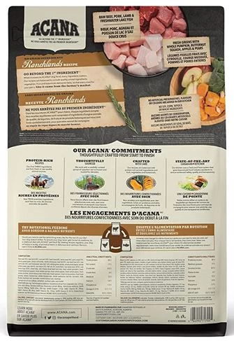 ACANA® RANCHLANDS® RECIPE for Dogs is formulated to meet the nutritional levels established by FEDIAF for all life stages except for growing large dogs. cut. Store in a cool, dry place. Unfit for human consumption | Metabolizable energy: 3790 kcal/kg (455 kcal for a 250ml/120g cup) with 37% from protein, 23% from fruit and vegetables and 40% from fat.