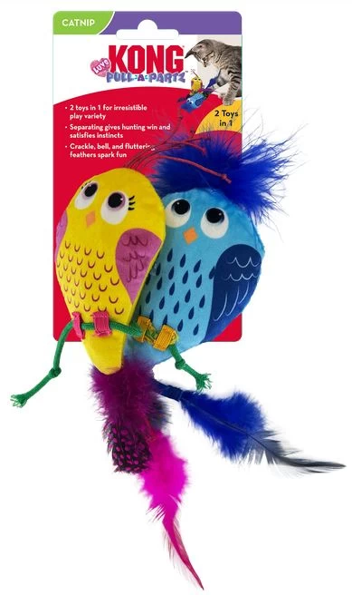 A colorful and attractive cat soft toy. Your cat will have fun with this pair of birds that is sweet with a bell inside. This toy crackles and has catnip inside. Your cat will have fun pulling on the feathers, ribbons and cords.