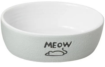 This simple cat bowl is gray with a white interior. It is ceramic and washes by hand. On the front, it has a mouse logo and “meow” written on it. It can be used for water or food.