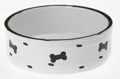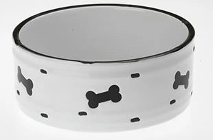 A stylish ceramic dog bowl from Petrageous. This white bowl with black bone patterns is perfect in any decor. It goes in the dishwasher. The bowl is FDA compliant.