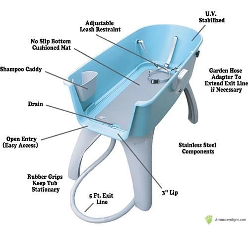 This dog bath has a maximum load capacity of 175 pounds and can be used for dogs such as: ST BERNARD – NEWFOUNDLAND – GRAND PYRENEES – BULL MASTIFF – MASTIFF Includes an easy-to-use 6-foot flexible drain hose, to plug into a washer drain or to drain into the tub or the sink. Also included is a 3-point adjustable harness for added safety while grooming the animal in the bath. Also a non-slip mat in the bottom of the bath. Includes also a support for shampoo bottle. Adjustable rinsing spout with its support included. Size of the bathtub: 21 inches and 1/4 wide X 50 inches long X 15 inches deep. With the legs assembled to the bath, the bath has a height of 32 inches and 1/2 “the total weight of the bath is 24 pounds.