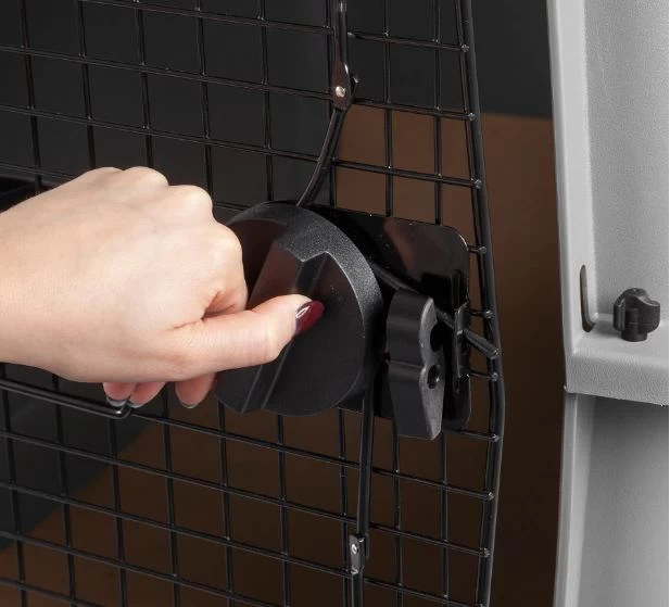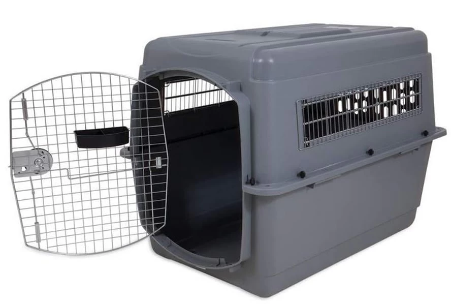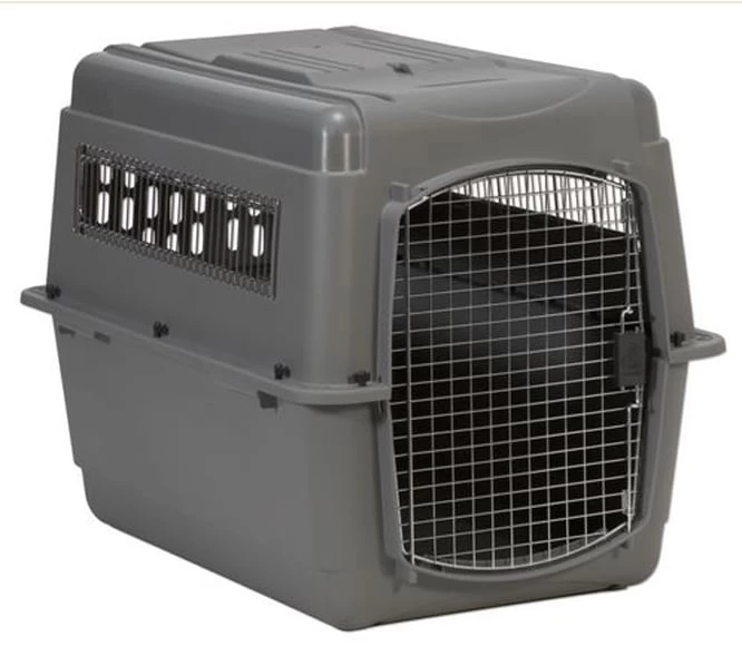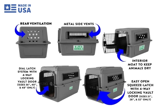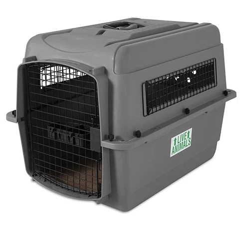 This airplane dog and cat carrier features high-strength, impact-resistant plastic construction, made in the USA, the heavy-duty metal door that interlocks for added security, ventilation windows for promote air circulation.