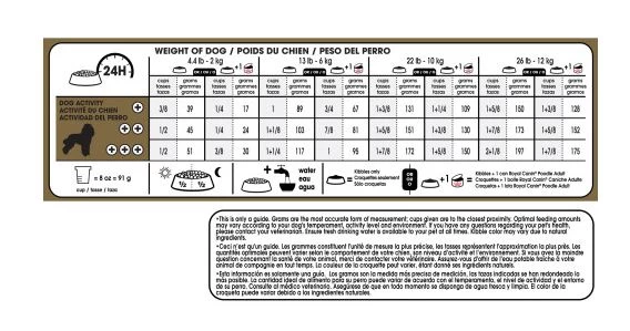 The kibble in this poodle formula is designed to make chewing easier since the poodle has a long snout and teeth that is characterized as a scissor bite. This food helps maintain healthy skin and coat with a complex of nutrients (EPA, DHA and vitamin A). It maintains muscle tone thanks to proteins.