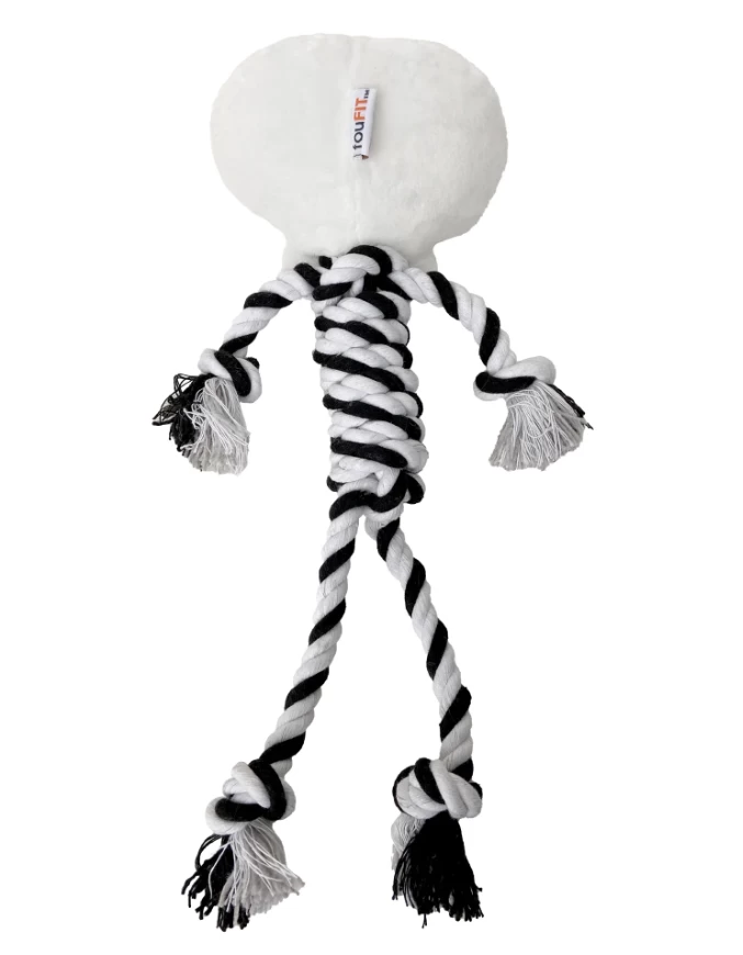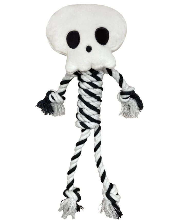 The Halloween Knotties Skeleton Plush Dog Toy from FouFit is a fun and sturdy accessory, ideal for celebrating Halloween with your companion. Shaped like a skeleton, it is made with durable materials and features rope knots for dogs who love to chew. Its soft texture, combined with scary but fun details, makes it an attractive toy for dogs of all sizes.