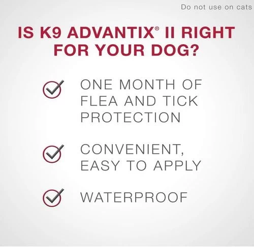 K9 Advantix II is a convenient monthly topical application that kills and repels fleas, ticks and mosquitoes. It is specially formulated for dogs with Imidacloprid, Permethrin and Pyriproxyfen for broad-spectrum protection against these disease-transmitting ectoparasites.
