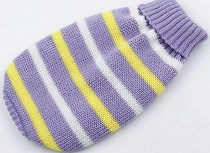 This yellow and purple striped sweater that will keep your dog warm on cool days.