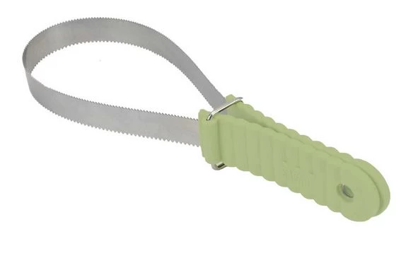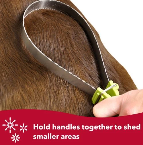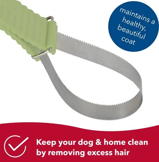 This grooming saw for dog shedding is perfect for removing dead hair on a medium to large dog. Its handle fits well in the hand and it has teeth on both sides of the saw. The blade is made of stainless steel. It can be used by holding the handles separately or together depending on the space to be covered on the dog. It is effective on short or long hair.