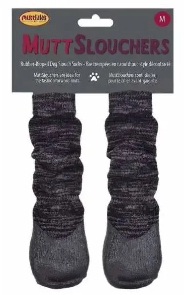 MuttSlouchers dog socks are non-slip and dipped in rubber all the way to the heels. The dog’s paw is warm thanks to the relaxed bottom with an elastic band to hold it in place. Boots are perfect for walking down the street. Are not water resistant.