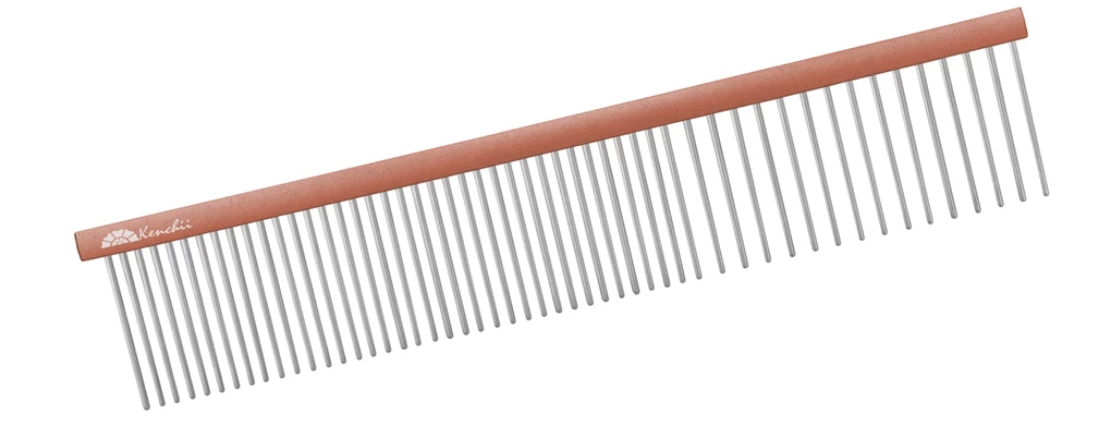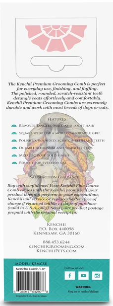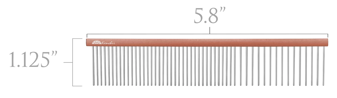 This 5.8 inch Kenchii grooming comb is small with polished, rounded, scratch resistant teeth. It is made of durable stainless steel and aluminum. It has a square back that allows a good grip while being comfortable with a Satin Rose Gold finish.