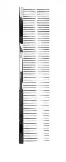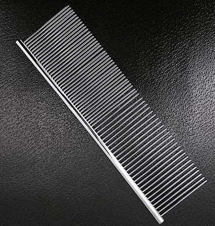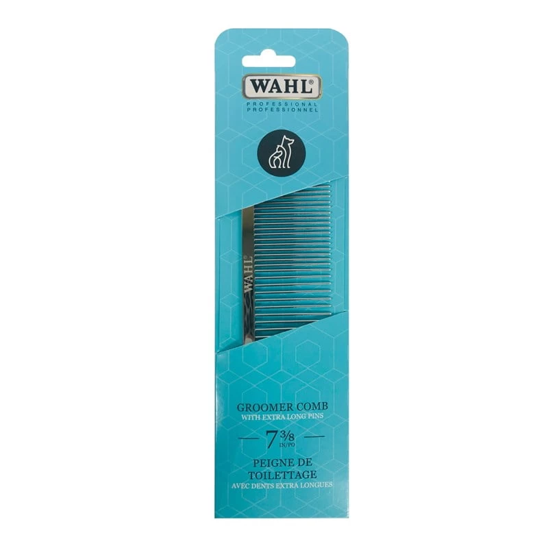 Wahl pet grooming comb with extra long teeth with rounded tips. It is designed in brass and steel with a chrome finish.