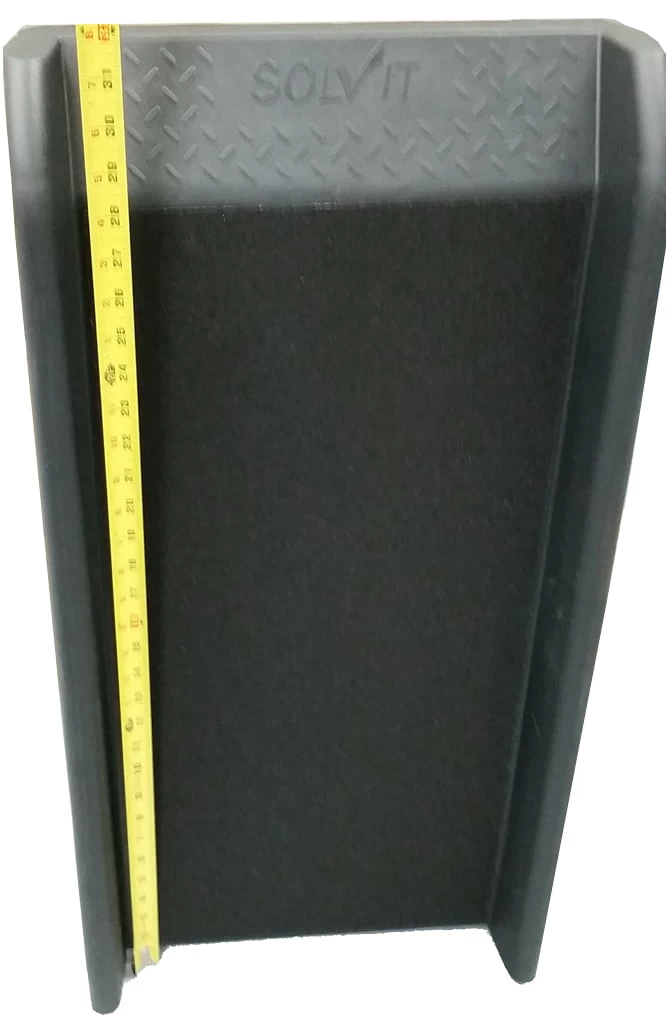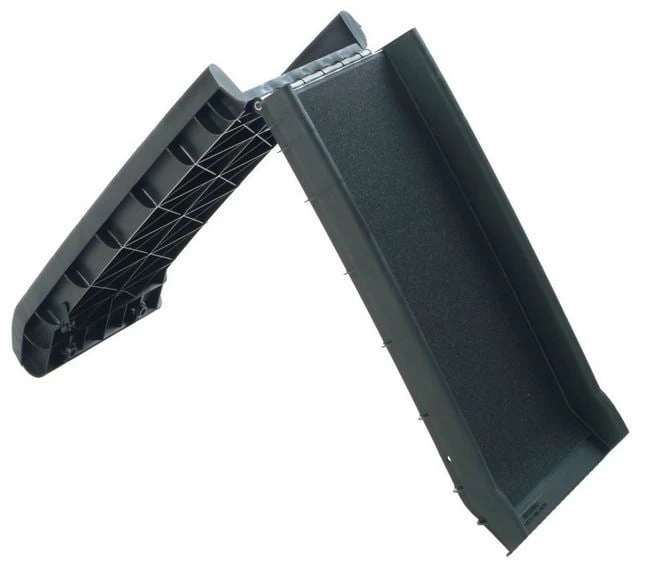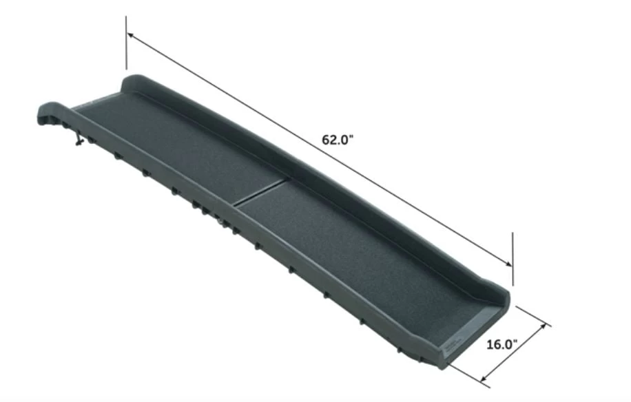 Solvit ultralite dog ramp with a weight of 10 pounds that can be folded for storage. The Petsafe dog or cat ramp has an adherent surface for your dog to climb up or down safely. It also provides a secure seating area to give pets confidence when climbing up and down. The ultralite ramp can support up to 150 pounds. Maintenance is easy. Ramp size is 62 inches x 16 inches x 4 inches.