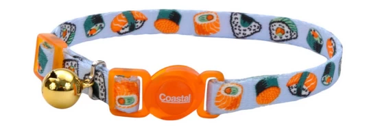 This release safety cat collar looks pretty with sushi designs. It has a bell and it is adjustable. This collar allows your cat to easily break free if he gets stuck. It is made of a soft fabric.
