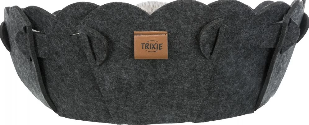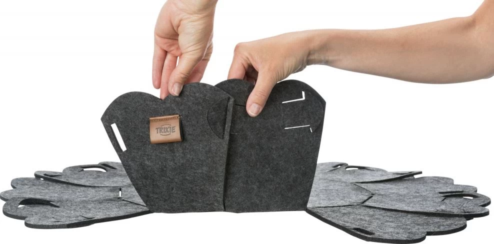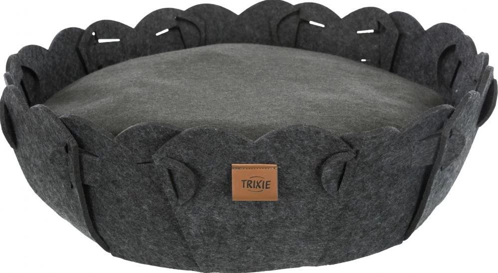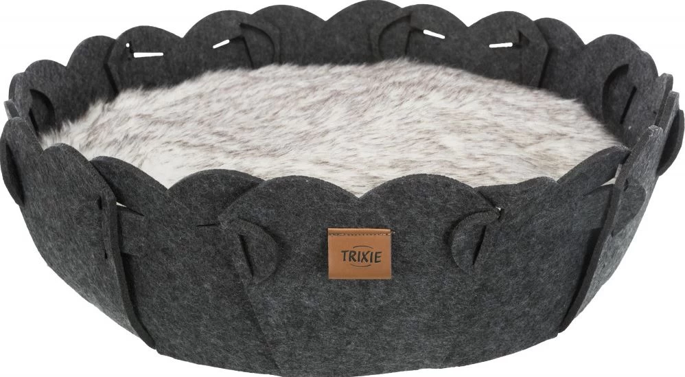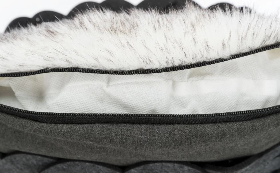 This round bed for your pet is made of felt (polyester) and its shape remains stable. The cushion is soft and reversible with a plush cover and fleece padding.