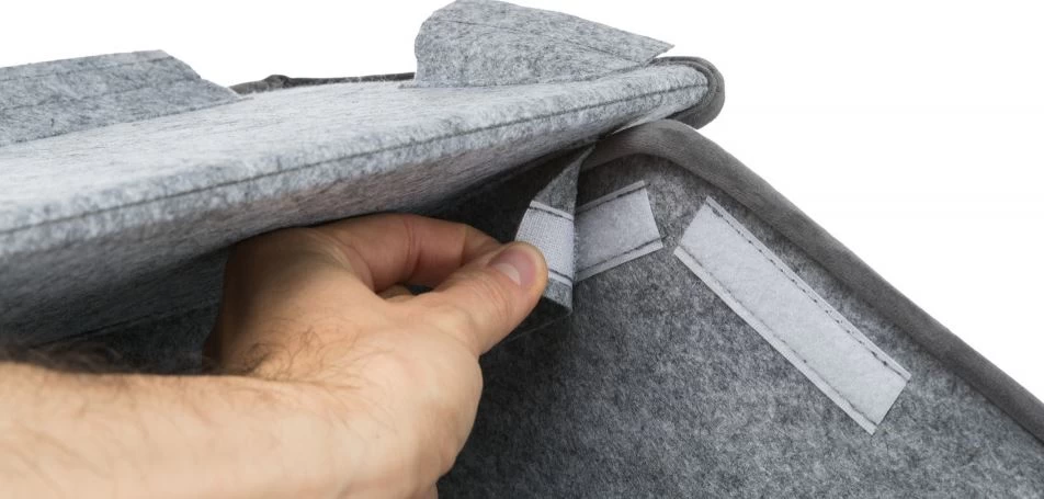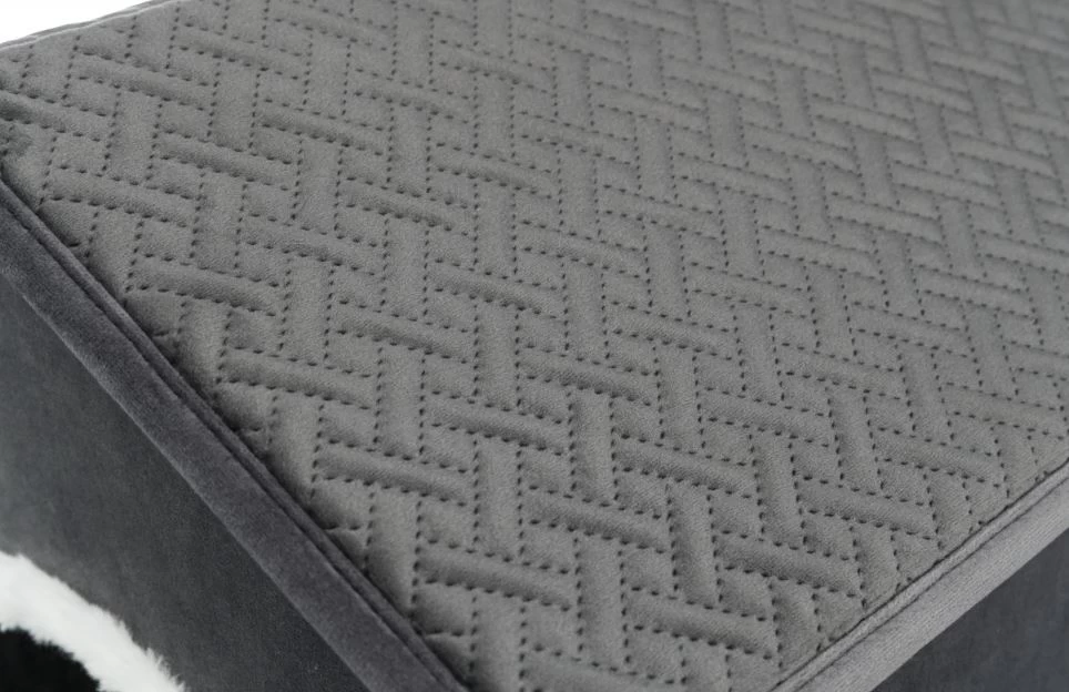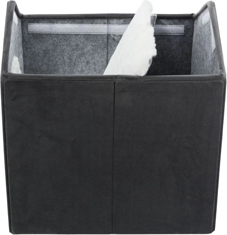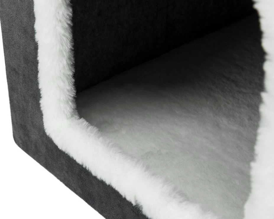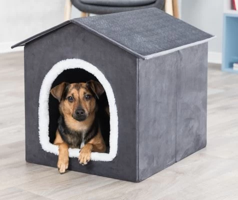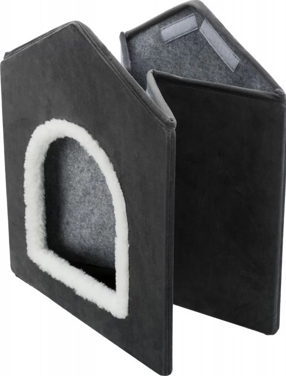 This shelter for your dog or cat is a pretty gray house. She has a white plush padded platform. It is foldable for storage and its roof is held in place by Velcro. The bottom is non-slip. The Livia shelter is easy to assemble. A comfortable house dog and cat bed.