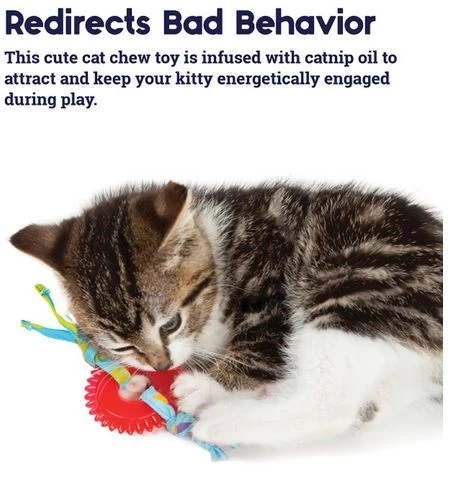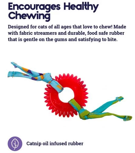 A cat dental toy made of rubber and infused with catnip oil. This teether helps remove tartar and cleans your cat’s teeth for healthy oral hygiene. The wheel spikes massage the gums while cleaning the teeth. The smell of catnip on the dental toy will attract your pet, and the ribbons add fun.